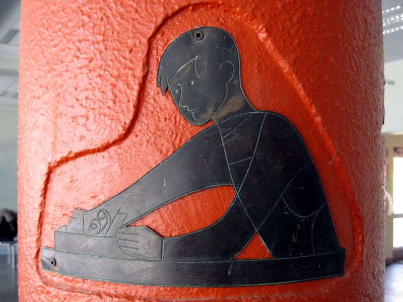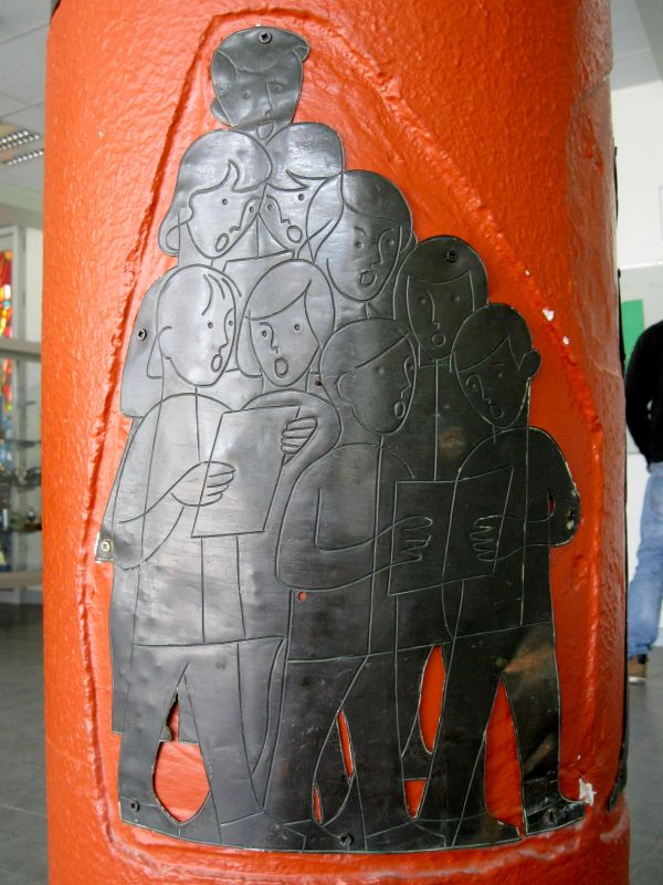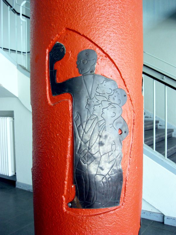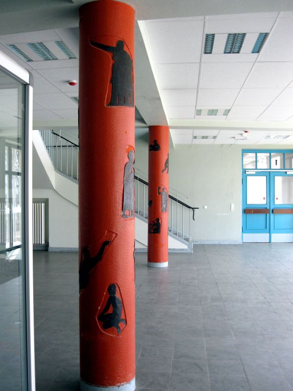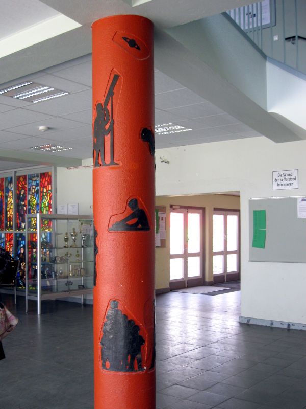 Der vielseitige Lübecker Künstler Karl Gieth hat 1954 für die Eingangshalle der Holstentor-Gemeinschaftsschule mehrere Kupfertreibarbeiten gefertigt, die typische Schulalltagsszenen zeigen. Sie sind als 23 bis 32 cm große Kupferbildnisse jeweils mit versetztem Abstand an zwei orange-braunen, zwei Meter hohen Säulen angebracht. Mit einfacher, klarer Linienführung hat der Künstler die Figuren und Szenen schülergerecht dargestellt. Beschädigungen führten allerdings im Laufe der Zeit zu einigen Fehlstellen. Die erste Säule zeigt überwiegend typische Szenen aus den Unterrichtspausen, wie sie sich auf dem Schulhof ereignen können. Auf der zweiten Säule sind verschiedene Unterrichtsfächer angedeutet.