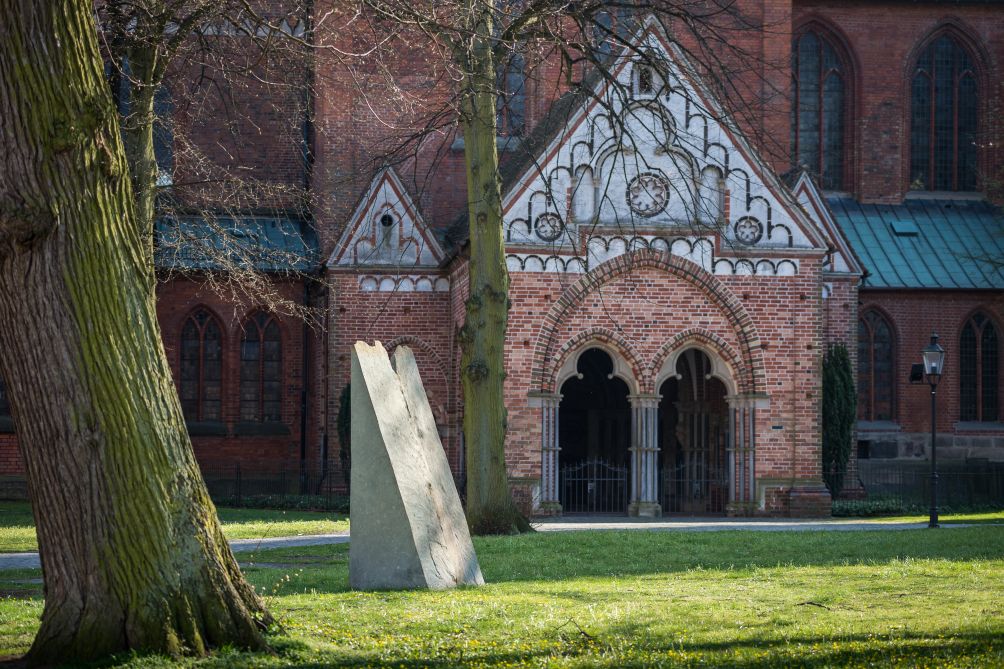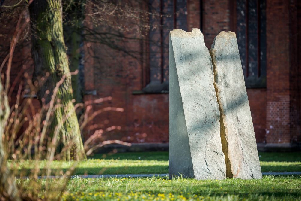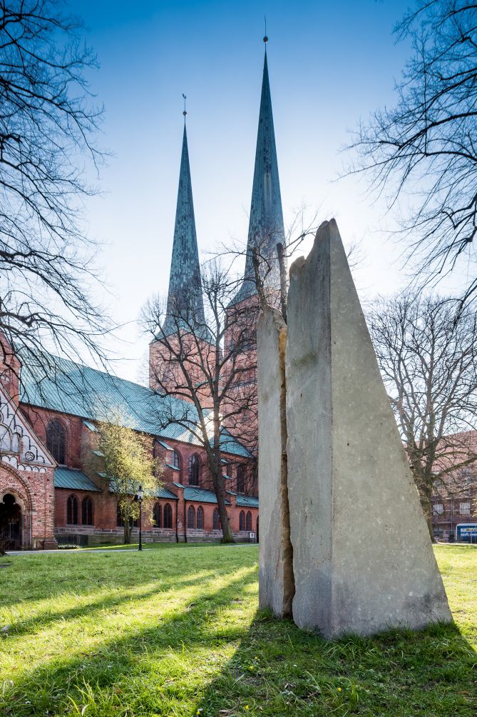 Mit einfachsten Mitteln schuf Jan Koblasa aus einem vorgefundenen Steinblock eine Skulptur, die ihre vieldeutige Aussagekraft aus den natürlichen Gegebenheiten des Steines schöpft. Der Künstler teilte den Stein und versetzte die beiden entstandenen Hälften mit den Außenseiten gegeneinander, er klappte gewissermaßen das geöffnete Innere des Steinblocks nach außen. Die Steinhälften stellte er dabei leicht zueinander versetzt auf. Ihre doppelte, spitzwinklige Dreiecksform greift deutlich erkennbar die Gestalt der Domtürme auf. Doch ein genaueres Betrachten und Umschreiten eröffnet vielfältige weitere Perspektiven. Die Struktur der glatten Steinflächen und der unregelmäßige Spalt, der von den zerklüfteten ehemaligen Außenseiten gebildet wird, ermöglichen Assoziationen an unterschiedliche Naturmotive, der Betrachter mag ausgebreitete Schwingen, Wellen, einen Wassersaum oder eine Felsklamm erkennen.