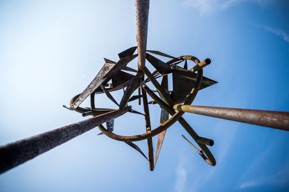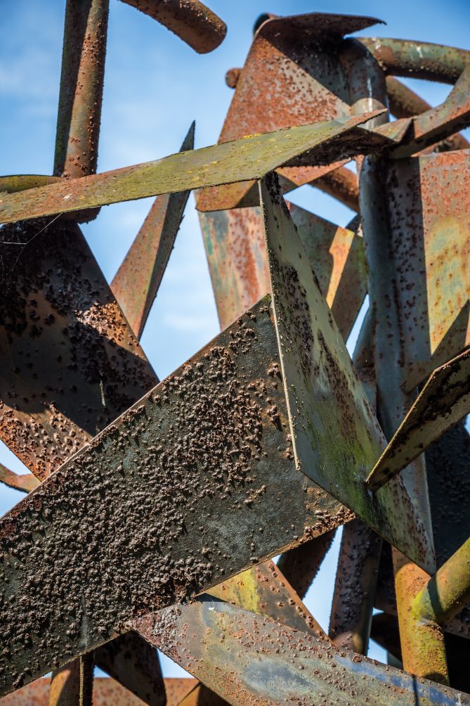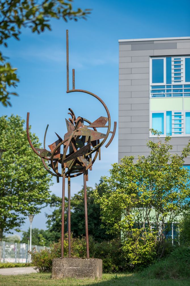 Auf dem Gelände der Technischen Hochschule Lübeck steht Pierre Schumanns 1976 entstandene Freiplastik aus Stahlrohren und Blechen. Auf einem Sockel sind drei aufstrebende Rohre befestigt, die die eigentliche Komposition einer offenen Kugel tragen. In einem gedachten Raum, der von einigen rund gebogenen Rohren begrenzt wird, wirbeln etliche kleine, eckige Stahlbleche durcheinander. Diese Dynamik ist fiktiv – der Betrachter assoziiert durch die Anordnung der geometrischen Elemente rotierende Räder oder planetarische Konstellationen. Nach oben hin stößt ein Rohr in den freien Raum – als Anbindung an das Universum. Schumann glaubte an die kosmische Orientierung des Menschen und fand über die Reduktion abstrahierende Ausdrucksformen für das Wechselspiel zwischen Naturimmanenz und Bewegungskräften, z.B. dem Wind. Mit der Freiplastik offenbart der Künstler den spannenden Kontrast zwischen Ruhe und Dynamik. Ihre Form steht im Zusammenhang mit Schumanns Frühwerk, zu dem mehrere Metallplastiken gehören, die französisch beeinflusst sind („groupe mesure“) und überwiegend in seinem Atelier in Hamburg entstanden. Hier realisierte der Bildhauer mit Metallstäben und -flächen unter Anwendung geometrischer Gesetze (u.a. Harmonielehre) größere Räume, indem er die Vorstellungskraft des Betrachters weckte.
