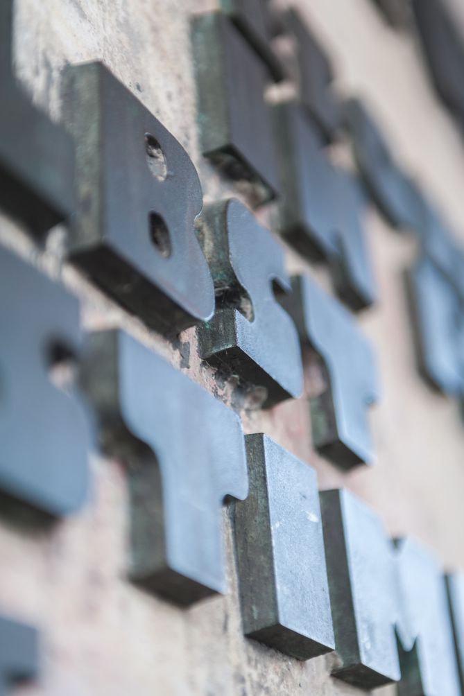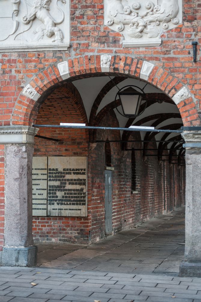 „DIE BERLINER / MAUER VOM / 13 AUGUST 1961 / TRENNT / DIE NATION / ABER DAS / GRUNDGESETZ / VERPFLICHTET“ (linke Platte) und „DAS GESAMTE / DEUTSCHE VOLK / BLEIBT / AUFGEFORDERT / IN FREIER / SELBST / BESTIMMUNG / DIE EINHEIT / UND FREIHEIT / DEUTSCHLANDS / ZU VOLLENDEN“ (rechte Platte). 1994 wurde nach einem Beschluss der Bürgerschaft das Relief um die aktuellen Ereignisse ergänzt: „3 OKTOBER 1990“ (linke Platte) und „DAS ZIEL IST ERREICHT“ (rechte Platte)