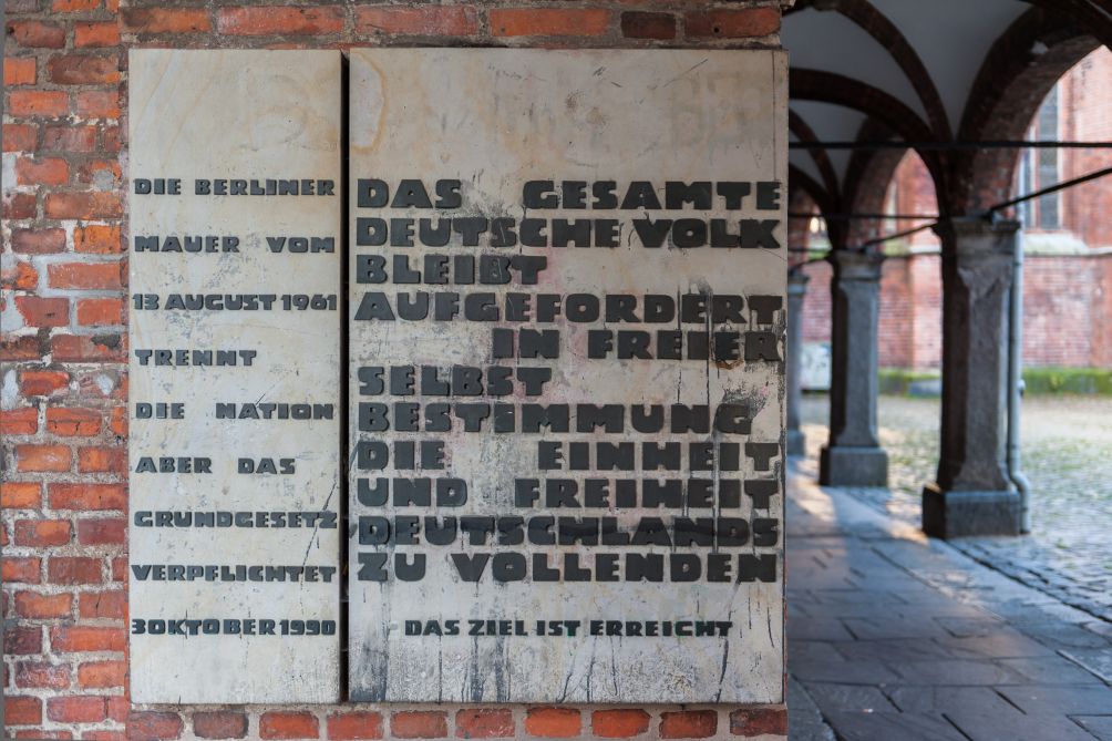 1975 wurde auf Antrag des Lübecker Senats von der Bürgerschaft die Errichtung eines Mahnmals beschlossen, welches an das Wiedervereinigungsgebot im Grundgesetz und an den Tag des Mauerbaus am 13. August 1961 erinnern sollte. Die Arbeit, die am 13. August 1975 enthüllt wurde, besteht aus zwei Steinplatten, deren reliefierte Inschrift lautete: