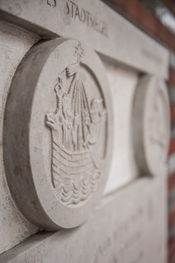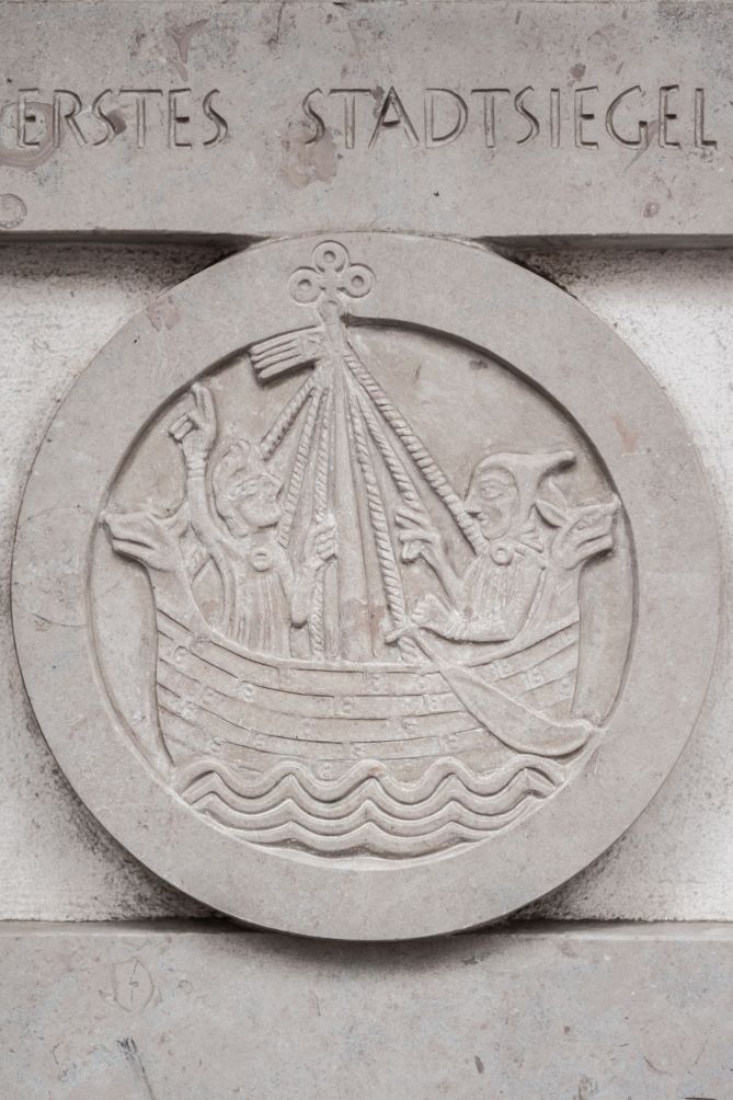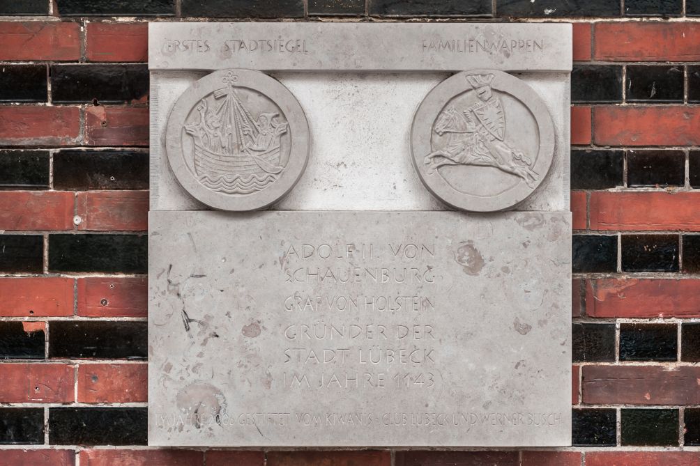 Im Jahr 1143 verlieh Graf Adolf II. von Schauenburg (1128-1164) einer bereits bestehenden christlichen Kaufmannssiedlung auf der Halbinsel zwischen Trave und Wakenitz das Stadtrecht und gab ihr in Anlehnung an eine 1138 zerstörte slawische Vorgängersiedlung den Namen Liubice. Die günstige geografische Lage und der Zugang zur Ostsee zogen zahlreiche Kaufleute an und sorgten für eine baldige Blüte der Hafenstadt. Nach einer verheerenden Feuersbrunst wurde Adolf II. zur Abtretung der Halbinsel an seinen Lehnsherrn Heinrich den Löwen, Herzog von Braunschweig, gezwungen, der die Stadt 1159 wieder errichtete, mit neuen Rechten und Privilegien ausstattete und sie ein Jahr später zum Bischofssitz erhob. Lange Zeit galt Heinrich der Löwe damit als Gründer der Hansestadt Lübeck, während die Rolle Adolf II. von Schauenburg in Vergessenheit geriet. Erst seit 2006 wird ihm mit einer vom Künstler Thomas Helbing gestalteten Gedenktafel unter der Renaissancetreppe des Rathauses gedacht. Die quadratische Gedenkplatte besteht aus Gotland-Kalkstein, den die Lübecker einst als Ballast in ihre Koggen luden, und zeigt in zwei kreisförmigen Medaillons das erste überlieferte Stadtsiegel sowie das Familienwappen derer zu Schauenburg. Der Text darunter lautet: „ADOLF II VON / SCHAUENBURG/ GRAF VON HOLSTEIN/ GÜNDER DER / STADT LÜBECK/ IM JAHRE 1143/ IM JAHRE 2006 GESTIFTET VOM KIWANIS-CLUB LÜBECK UND WERNER BUSCH“.