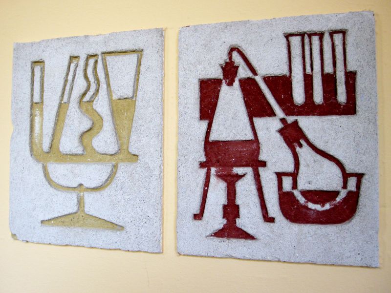 Gieth beschränkte sich bei seinen Emblemen auf einfarbige Darstellungen. Obwohl stark schematisch vereinfacht, geben die informativen Symbole die Raumfunktionen klar und gut verständlich wieder. Gekennzeichnet sind so beispielsweise Büro, Chemieraum, Schneiderwerkstatt, Bücherei sowie Waschräume für Jungen und Mädchen. Besonders eindrücklich wirken die meist in Rotbraun gehaltenen Schilderungen der Lübecker Baudenkmäler. Das Holstentor mit St. Petri, die eindrucksvolle Fassade der Katharinenkirche oder das in Gelb ausgeführte Behnhaus mit seiner charakteristischen Figurenbekrönung sind nur drei der vom Künstler ausgewählten Motive.