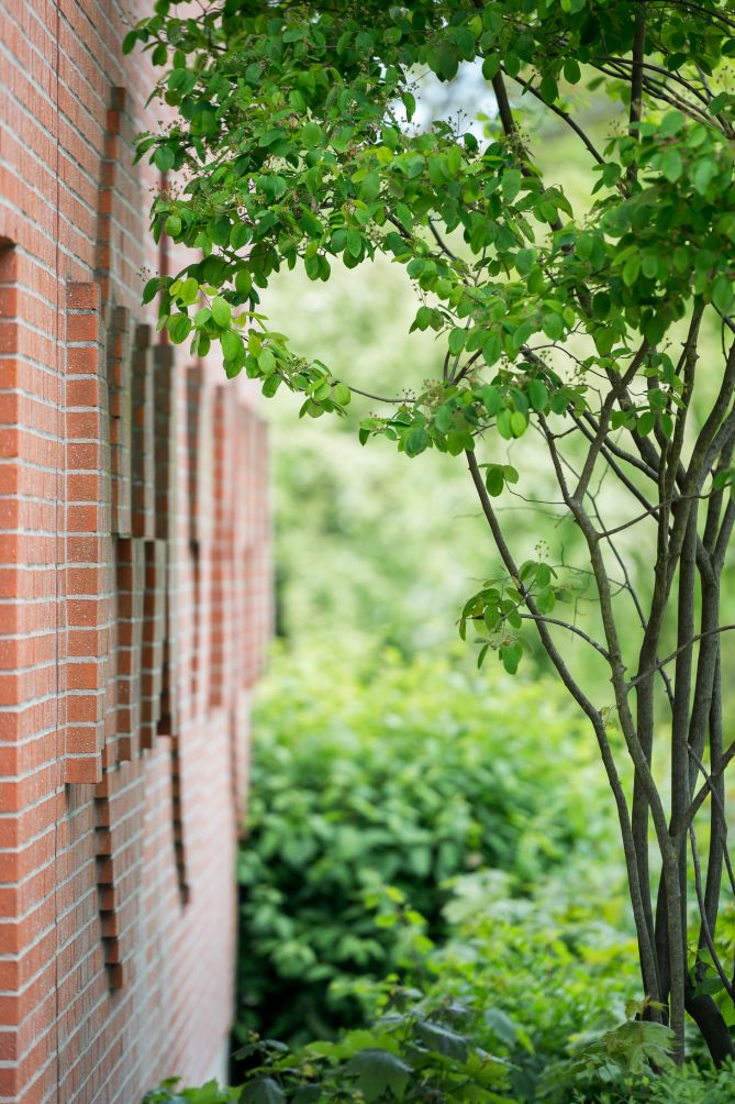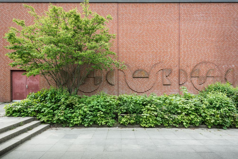 Das schlichte Ziegelrelief, das sich an der Wand der Schulturnhalle entlangzieht, zeigt locker aneinandergereihte Bogenformen, Kreise und Kreissegmente, die an eine geheimnisvolle Schrift oder an eine Abfolge mechanischer Bauteile erinnern. Das Reliefband besteht aus denselben Steinen wie die Mauer und akzentuiert sie alleine durch die unterschiedlich weit vorspringenden Ebenen. Es bezieht seine besondere Wirkung aus dem Licht- und Schattenspiel, das sich je nach dem Stand der Sonne und der Intensität ihrer Strahlung verändert.