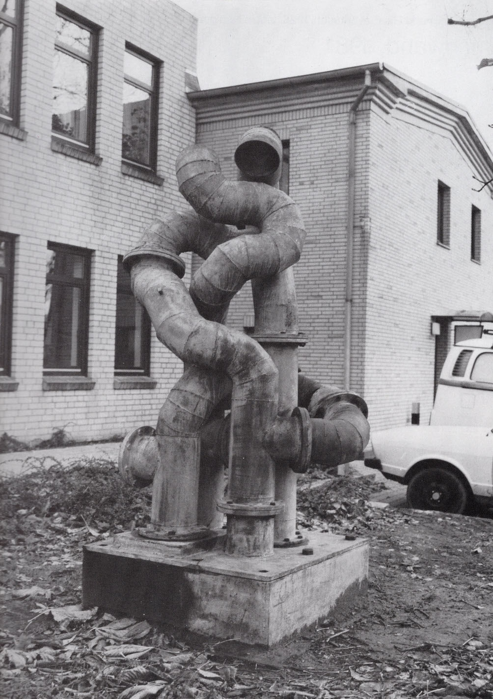 Mehrfach ineinander verschlungene Stahlrohre bildeten die freistehende Plastik vor dem Eingang des Berufsfortbildungswerkes. Sie setzte sich aus einzelnen Röhrensegmenten zusammen, die miteinander verschweißt und verschraubt waren. Das Werk entstand im Rahmen des Pilotprojektes „Künstler – benachteiligte Personengruppen?“, das auf eine Initiative des damaligen Bundesministers für Bildung und Wissenschaft Björn Engholm zurück ging und mit Bundesmitteln finanziert wurde. In Zusammenarbeit mit dem Künstler fertigten Schülerinnen und Schülern des Lübecker Berufsfortbildungswerkes, Fachbereich Maschinenschlosser, die Plastik in den hauseigenen Werkstätten.